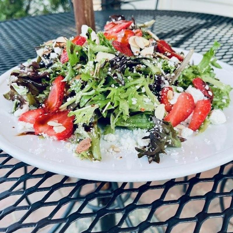 sliced strawberries, local greens, goat cheese, almonds, green tomato vinaigrette, balsamic reduction