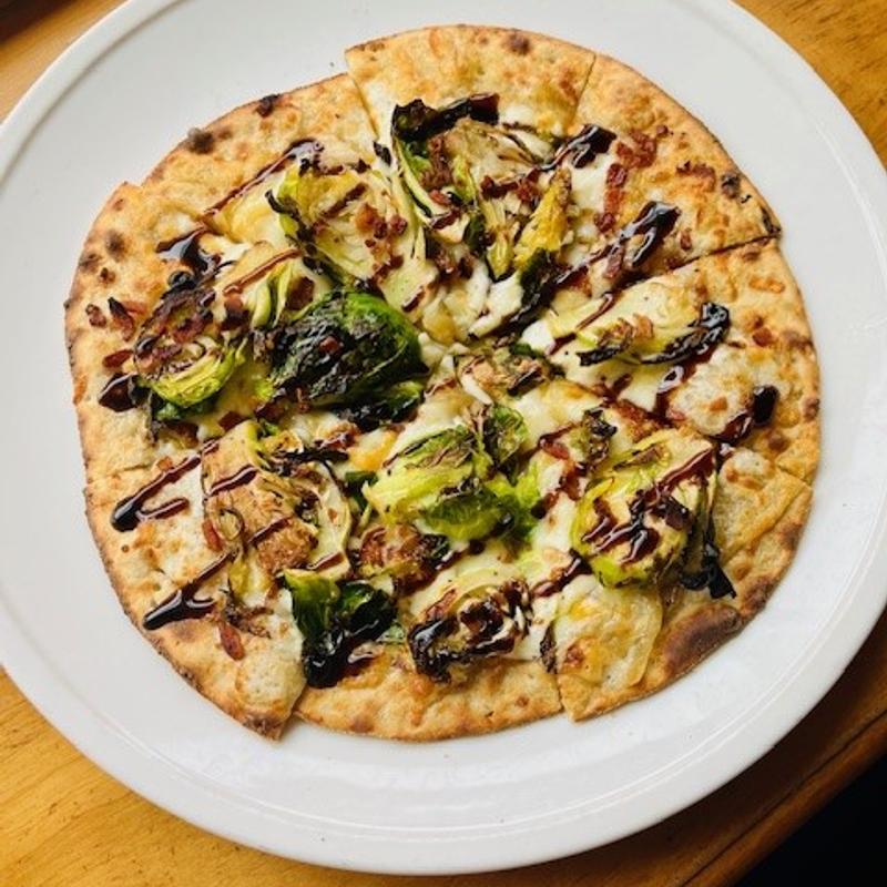 roasted Brussels sprouts, caramelized onions, fontina, mozzarella, bacon, balsamic reduction