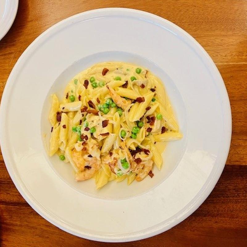 shrimp, shallots, peas, bacon, penne, parmesan egg cream