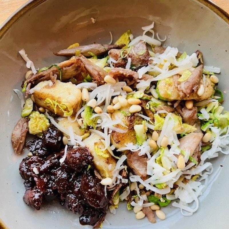 gnocchi, cherry mostada, pine nuts, shaved Brussels sprouts, drunken goat cheese (small plate)